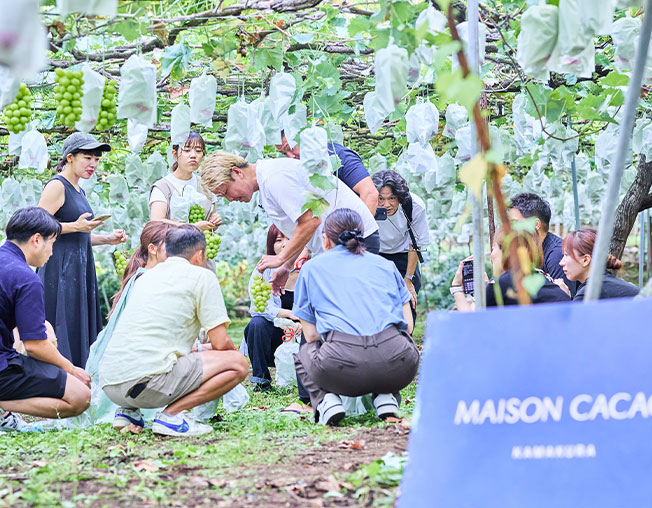ブランド作り、製品づくりにとって重要な取り組み「旅するメゾン」。北は北海道から南は沖縄まで、最高の素材を求めて、日本各地の果樹園や畑を訪ねる。その土地の風土を肌で感じ、生産者の方々の想いを伺い、素材の個性をしっかりと受け止める。その行程を「旅するメゾン」と名づけ、毎月行っています。その旅はどの部署でも参加できるのが魅力。みんなでブランドを作り届けるチームだからこそ、全員が同じ景色を見ることを大切にしています。座学では決して得ることのできない本質に触れて、今までになかった価値を世の中に提供していく、そんな機会になっています。