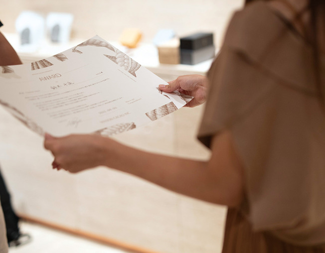 メゾンカカオでは毎年の年間テーマと3ヶ月ごとのテーマがあり、そこに対して果敢にチャレンジし、成長と実績を生んだメンバーを表彰する制度を設けています。表彰するのはあくまでその人の活躍に対して。ノルマなどの数字に対しての表彰ではありません。表彰式では創業者が一人ひとりへのメッセージを考え、自ら授与を行い、表彰者や参加するメンバーが感極まる場面も。一年を通してめざましい成長と実績を重ねたMVPには豪華特典として旅行券が贈られます。