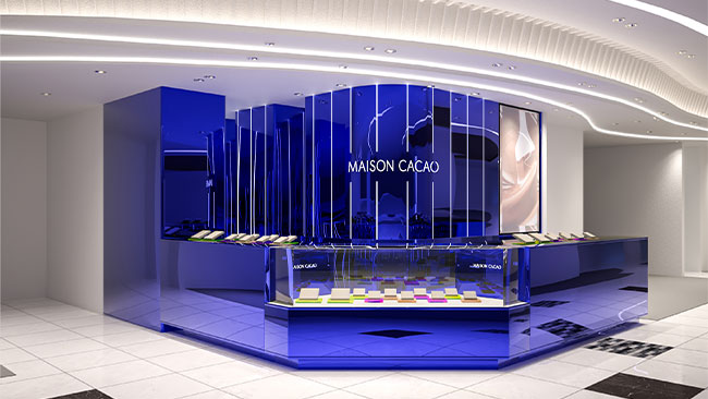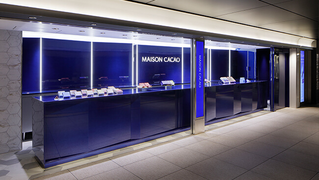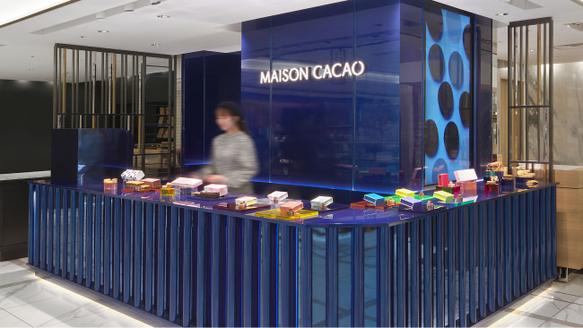 世界のハイブランドが軒を並べる横浜NEWoManのグランドフロアに、日本生まれのチョコレートブランドとしてメゾンカカオが出店。フランスやイタリアの職人がハンドメイドでつくった資材を使い、上質な室内空間に仕上げました。店内にはメゾンカカオを象徴する数々のアートが飾られ、ギャラリーのような雰囲気を醸します。最高級素材からつくられた、なめらかな口どけの生チョコレートの品揃えは全店舗随一。カカオを使用した贅沢なコスメティックスやスーパーフードも取り揃えた幅広いラインナップでお客様の日常を上質に彩ります。