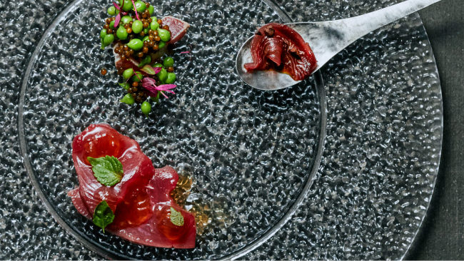チョコレートバンクの営業時間終了後、新たなる美食の舞台が幕を開けます。ROBBは料理の素材としてのカカオにクロースアップし、“カカオ料理”のフルコースを提供するガストロノミー。アミューズからメイン、デザートまで、すべての皿にチョコレートバンクならではの創造性が遺憾なく発揮されています。シェフの石原紳伍がとりわけ力を注ぐのがカカオと組み合わせる魚料理。根菜や肉料理のアクセントとして使われることはあっても、魚とカカオの組み合わせは世界でも稀。この場所でしかつくれない。この場所でしかつくらない。そんな矜持を持ちながら、カカオの可能性をどこまでも広げていきます。